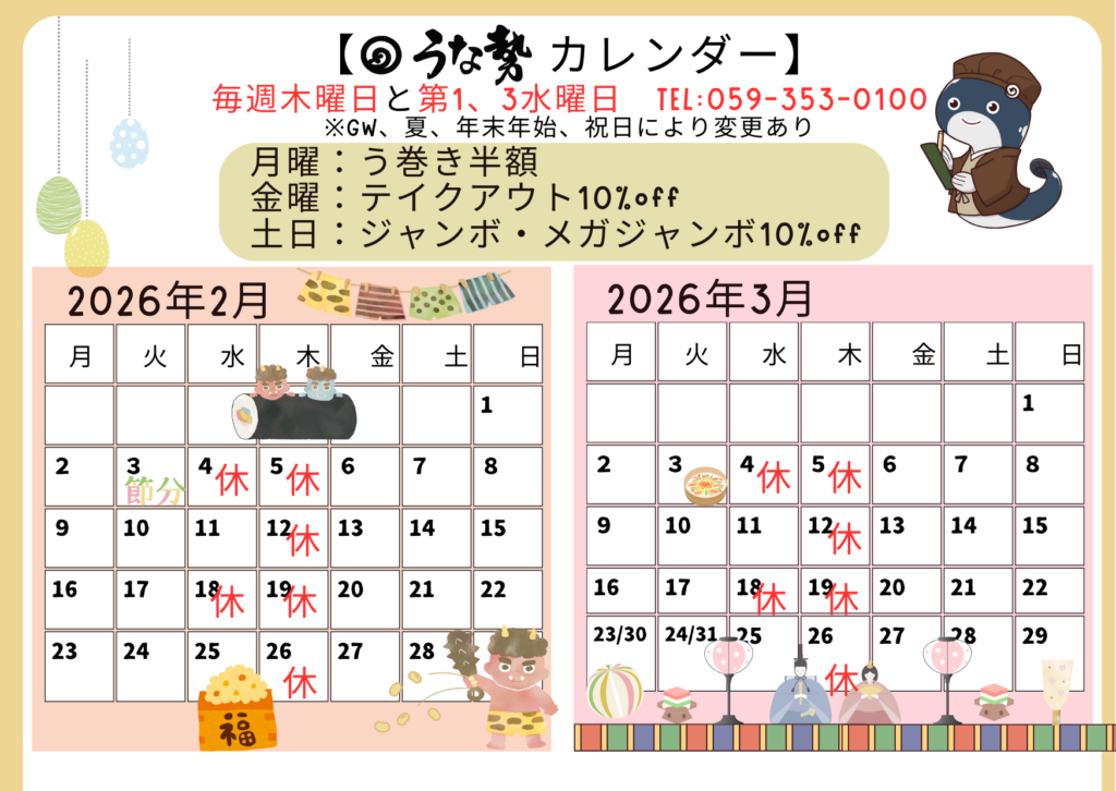 2026年2月~3月の営業カレンダーです^^